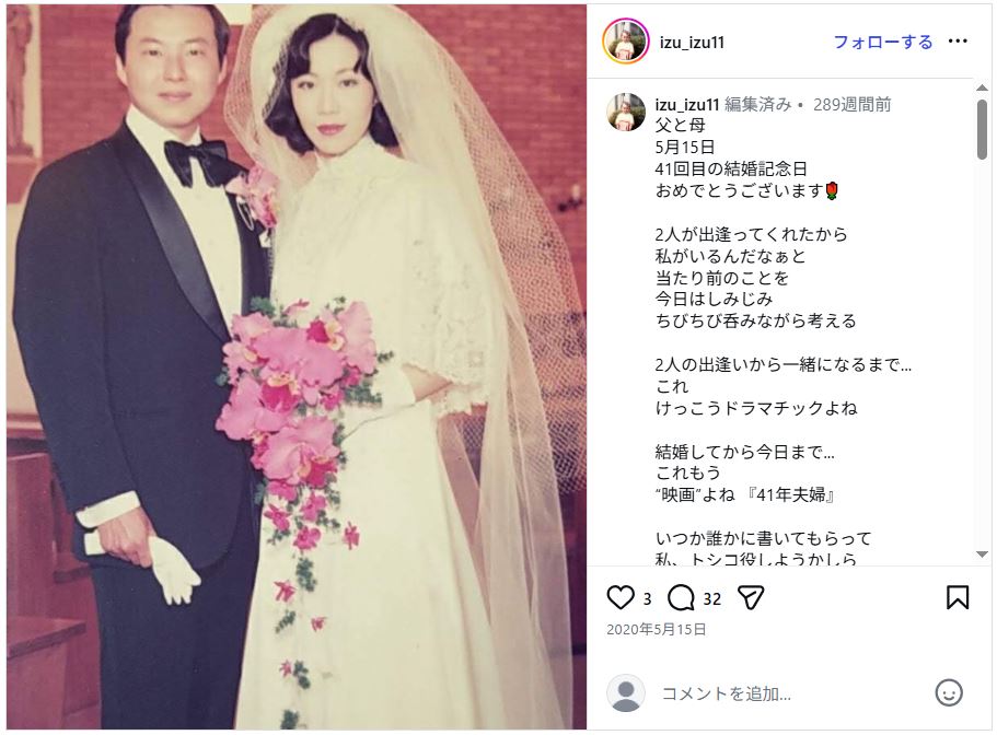 松岡依都美さんのInstagram投稿の中には、両親の結婚記念日を祝うものがあり、その内容から家族の温かさや、両親への強い敬愛の気持ちがストレートに伝わってきます。例えば、「父と母 5月15日 41回目の結婚記念日 おめでとうございます」という投稿では、「2人が出逢ってくれたから私がいる」としみじみ語り、「2人の出逢いから一緒になるまで…これけっこうドラマチックよね」と振り返っています。