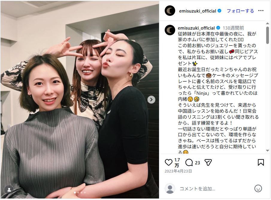 特に印象的なのが、中国から来日した従姉妹を迎えてのホームパーティの投稿です。この投稿では、母親を含めた家族全体で集まり、誕生日祝いをしたり、お揃いのジュエリーを贈り合ったりする様子が描かれていました。家族の国籍や住む場所が違っても、絆はしっかり続いていることが分かります。
