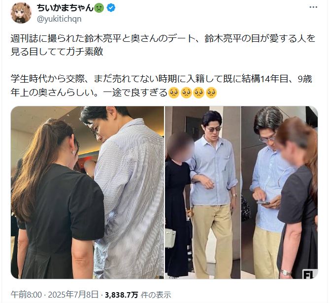 記事によると、都内の映画館で鈴木亮平さんが「有村架純さんに似ている」と話題の奥さんと2人、ラブラブな様子で映画を楽しむ姿がキャッチされています。サングラス姿で現れた鈴木亮平さんは、終始奥さんに優しく微笑みかけていたそうです。