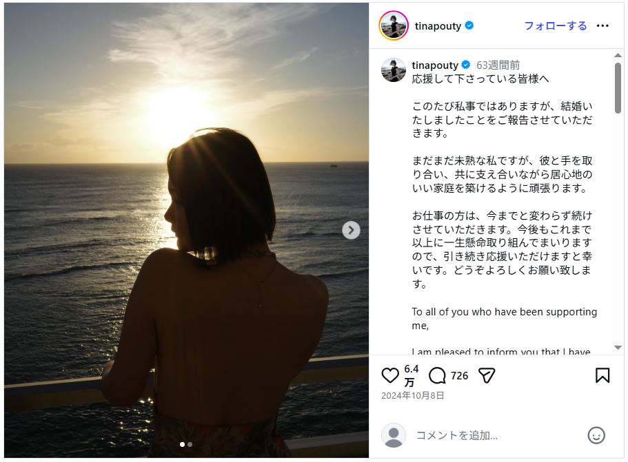 ティナさんのSNS(ソーシャル・ネットワーキング・サービスの略。ネット上で交流するためのサービス)やインタビュー記事を見ると、気取らず等身大の自分を見せていることが多いです。飾らない言葉や、自分の好きなものを素直に発信する姿に共感するファンがたくさんいます。最近は「親近感がある」「友達感覚で応援できる」といった声も増えています。