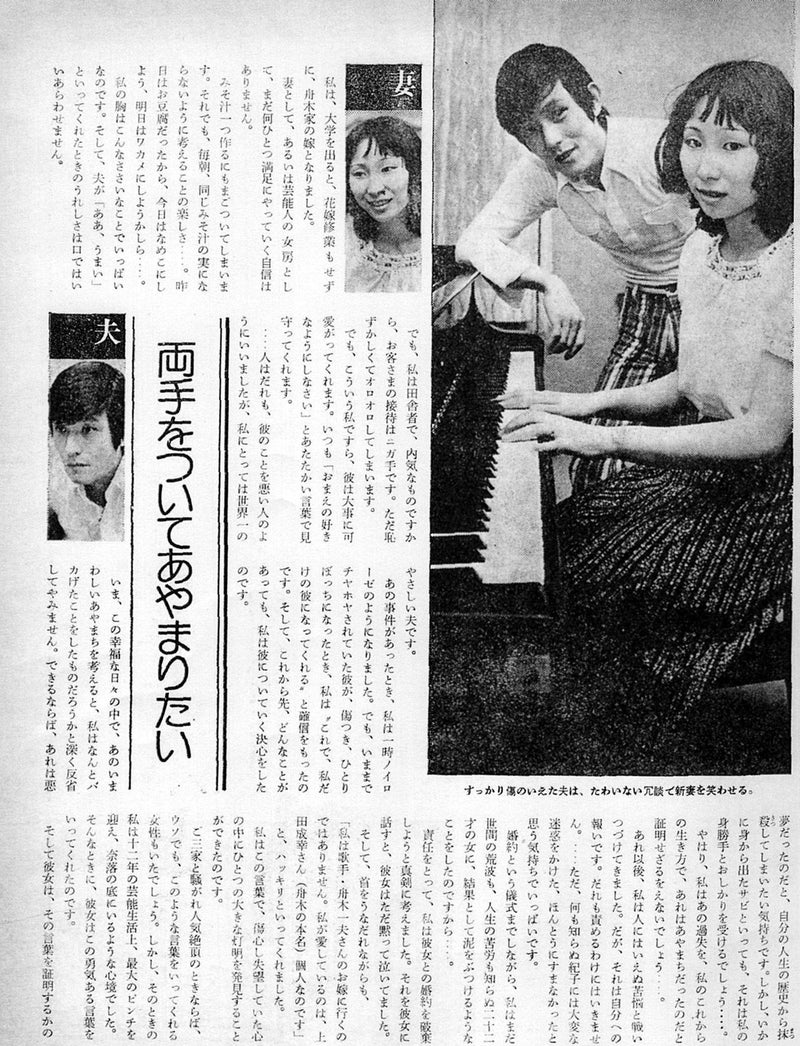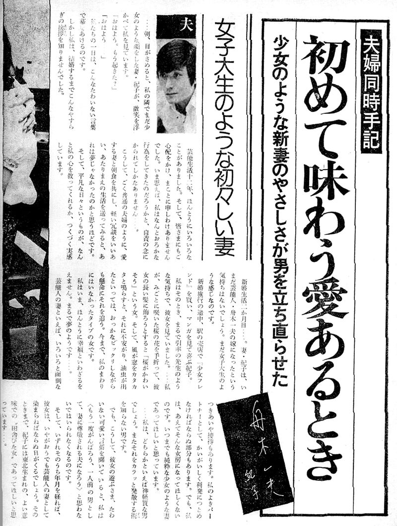夫婦同時手記とは、1974年4月29日に結婚された舟木一夫さんと松沢紀子さんが、結婚直後にそれぞれの立場から心境を綴った特集記事のことです。いわば、夫婦が同じ誌面で同時に胸の内を明かした記録で、当時としてはかなり異例の企画でした。